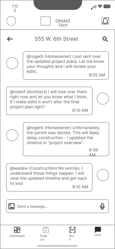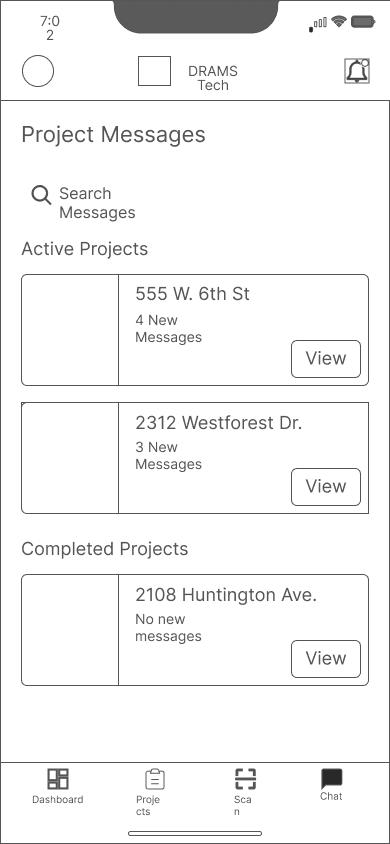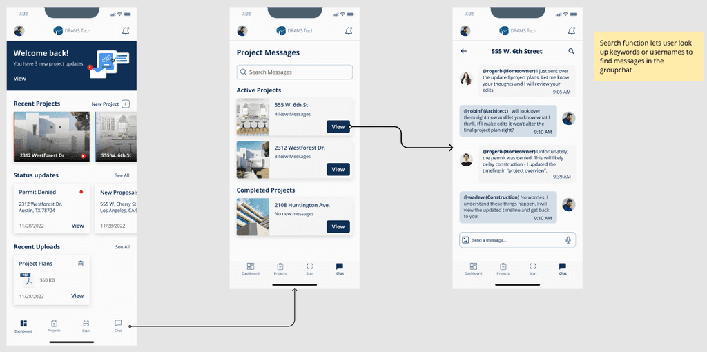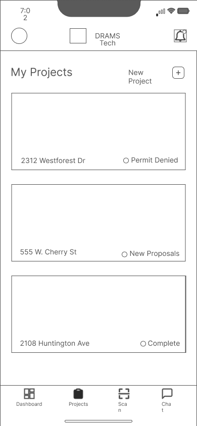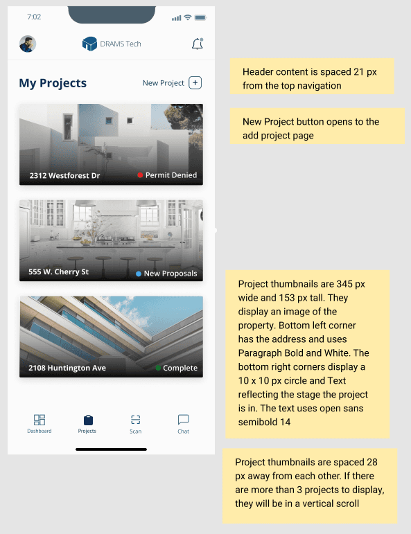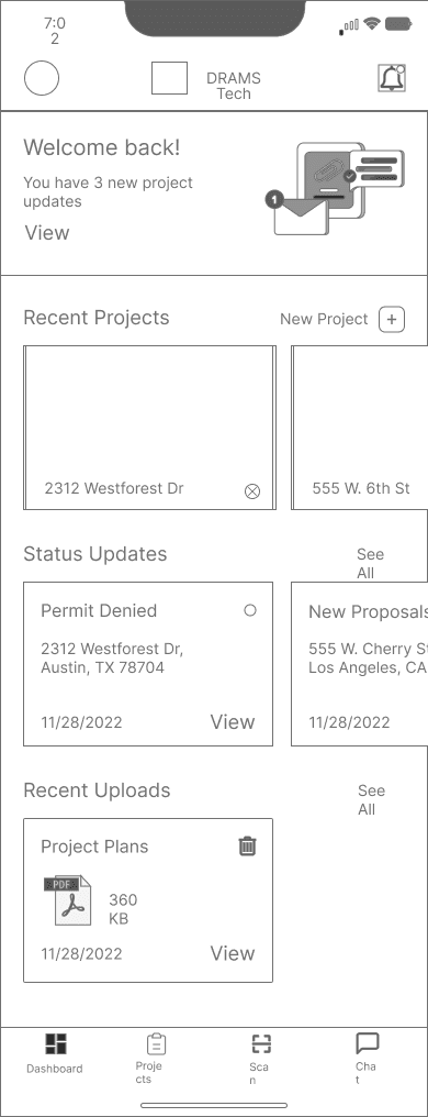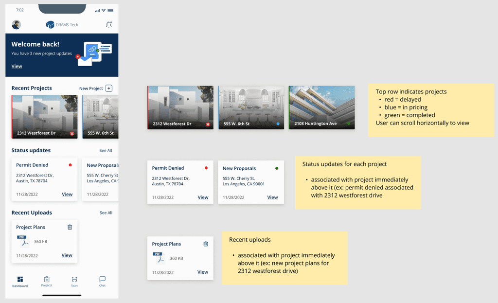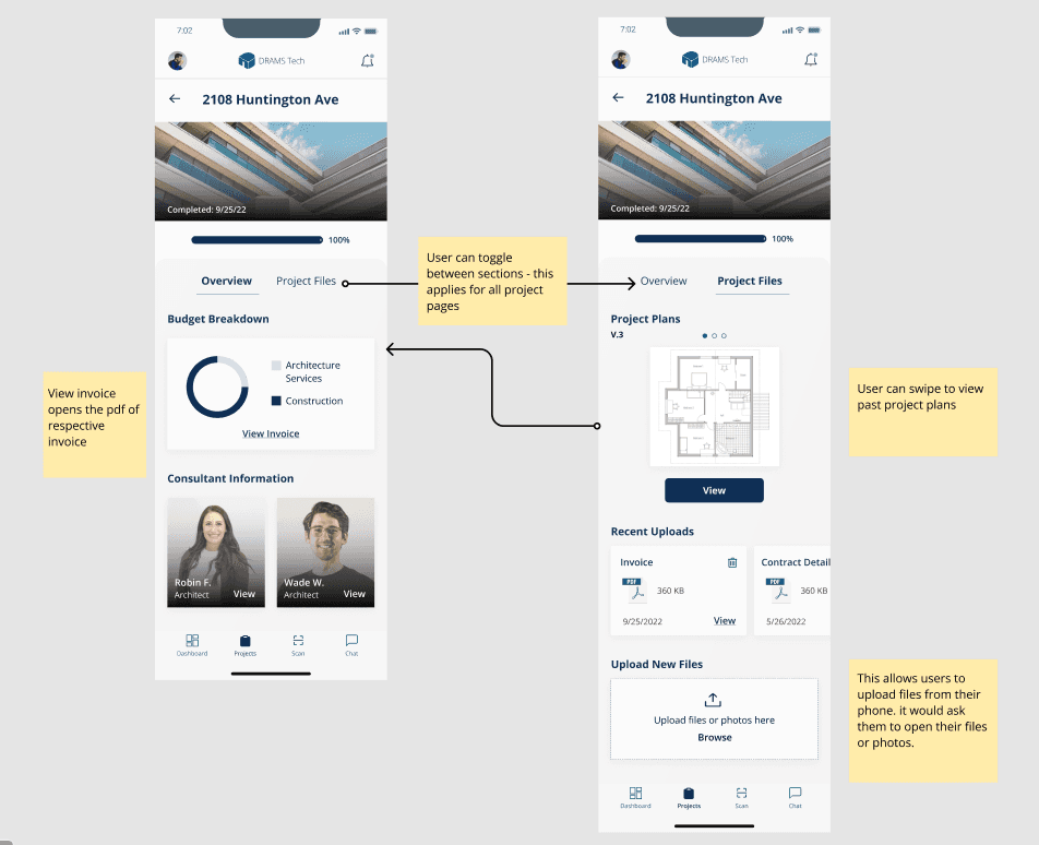 I was assigned to check active projects' status user flow. Before creating the screens, I had to identify what information needs to be displayed. The user needs to be able to view project updates, status, project plans, and project documents. This helped visualize how the screens would look, which made the wireframing process easy.