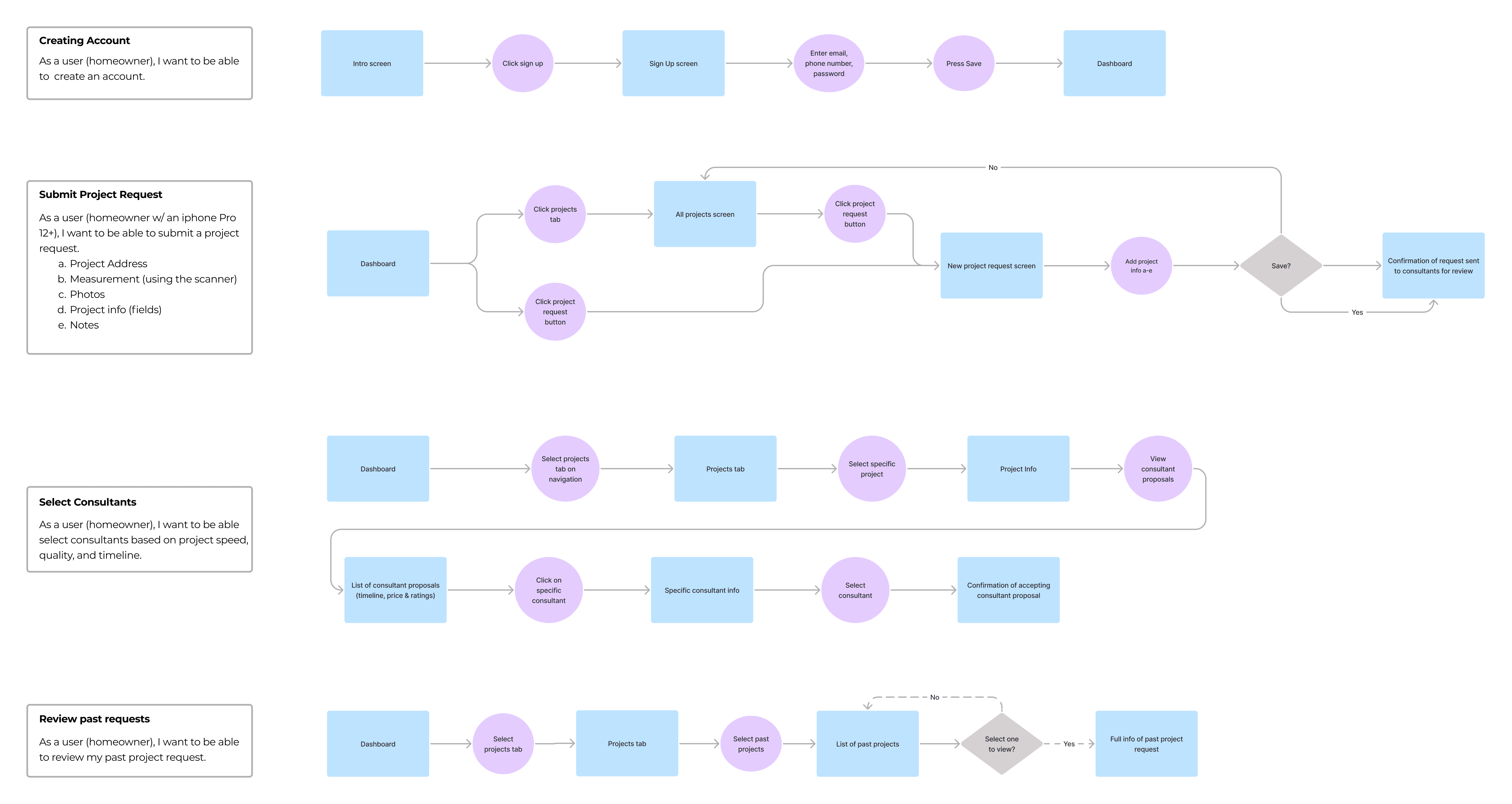 Using the user stories that the client provided, our team created user flows that focused on the features that the client asked for. We wanted the navigation of the app to be user-friendly and only include essential steps depending on the feature.