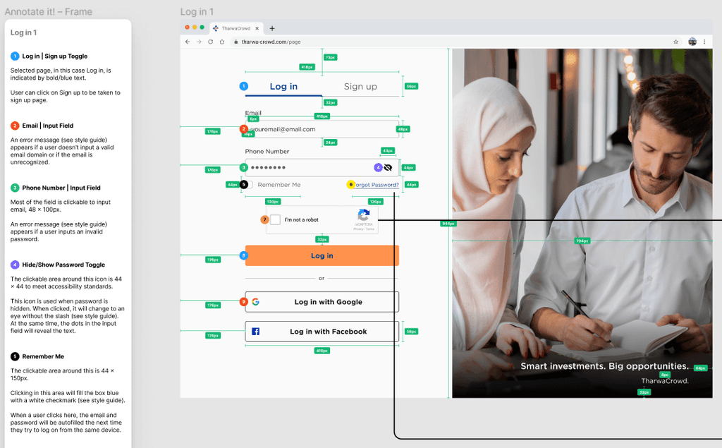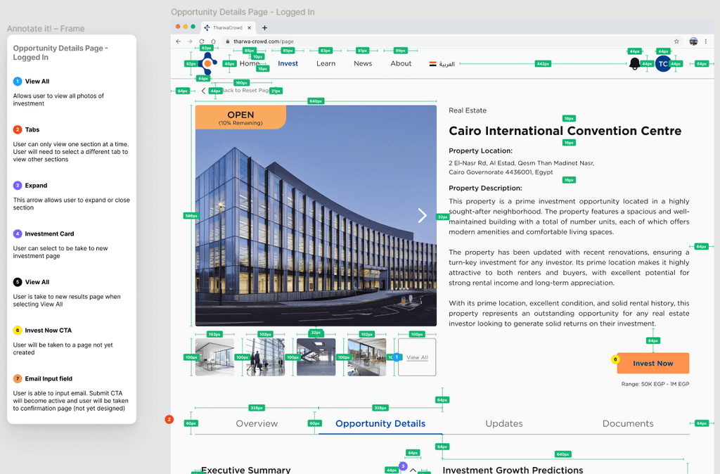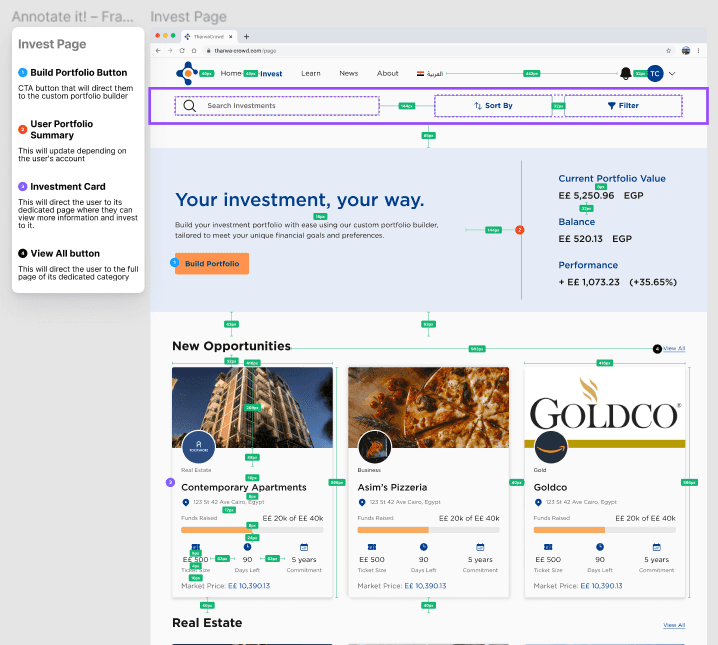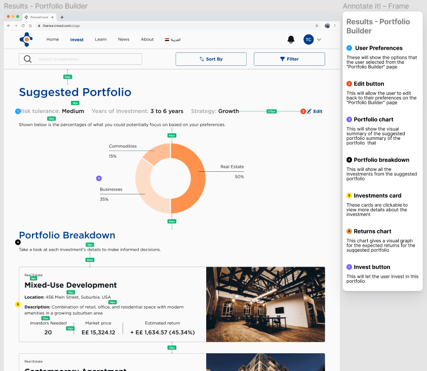 We inserted measurements and notes for each screen to ensure that developers understand the design specifications and understand the intent of the design. I annotated screens for the Home page, Portfolio builder, and Suggested portfolio.
