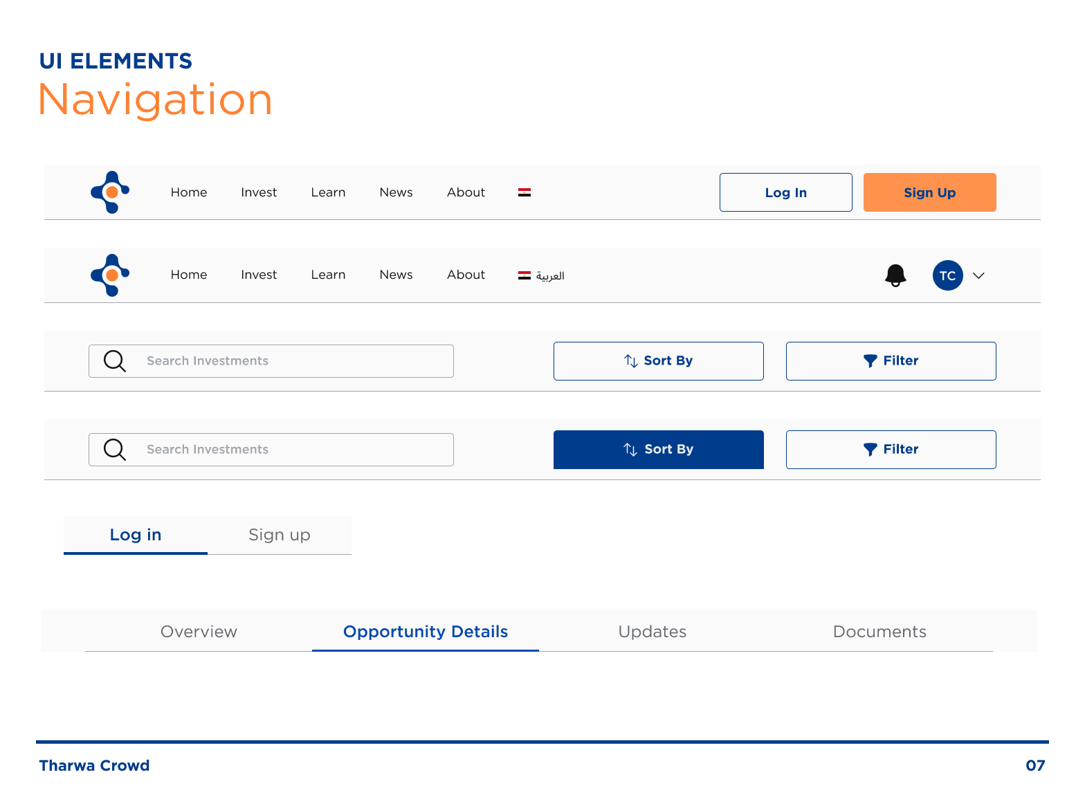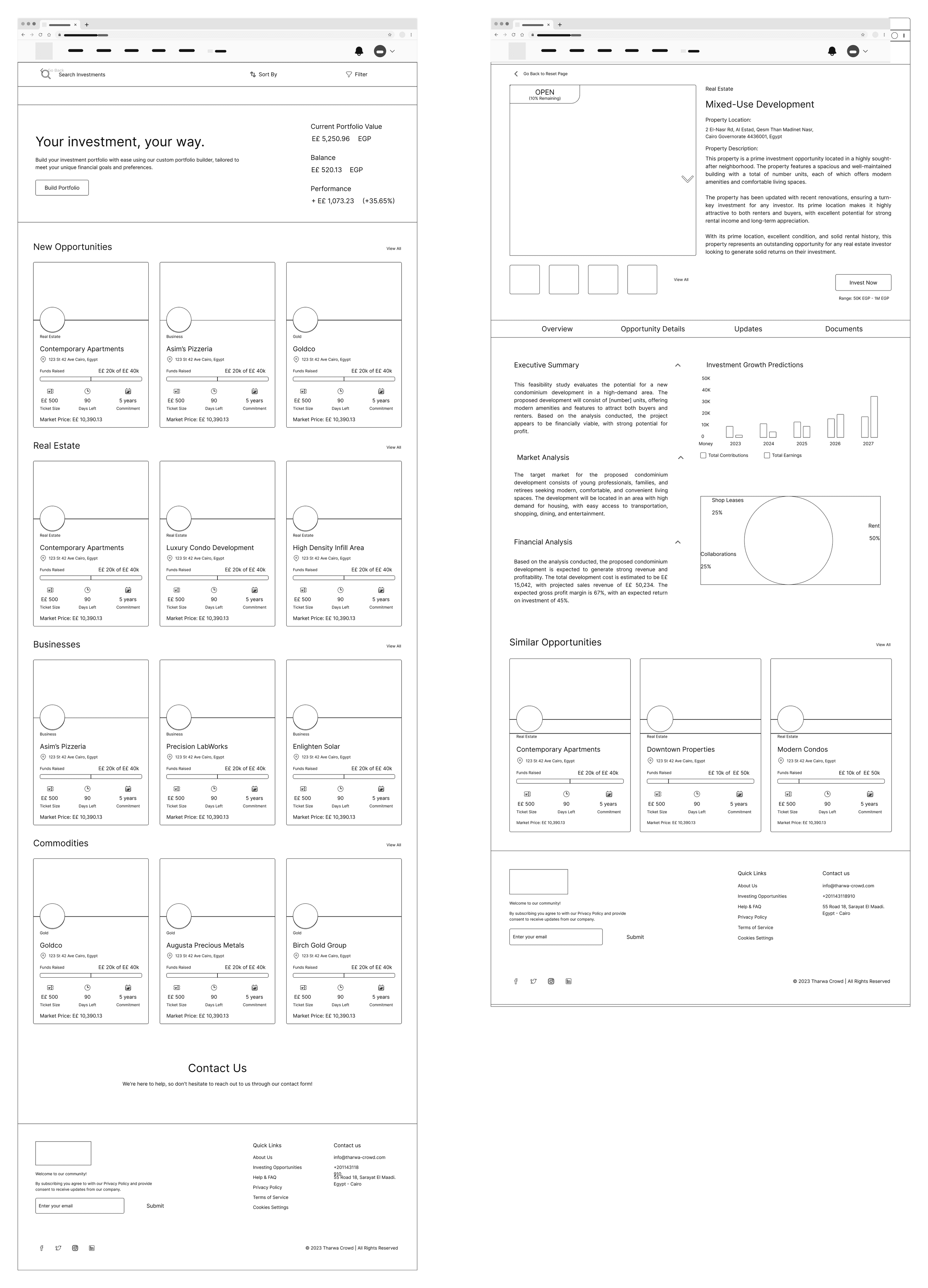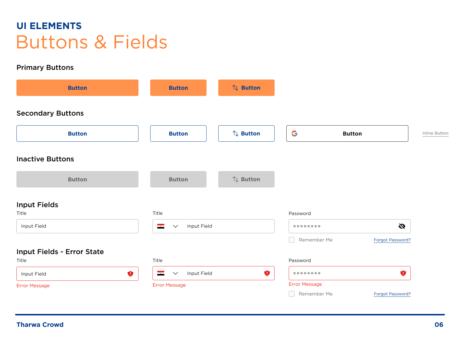 Our team established a style guide that adhered to Tharwa Crowd's branding guidelines. We utilized the company's colors, typography, and layout grid to ensure consistency across all screens while ensuring that all colors met accessibility standards.