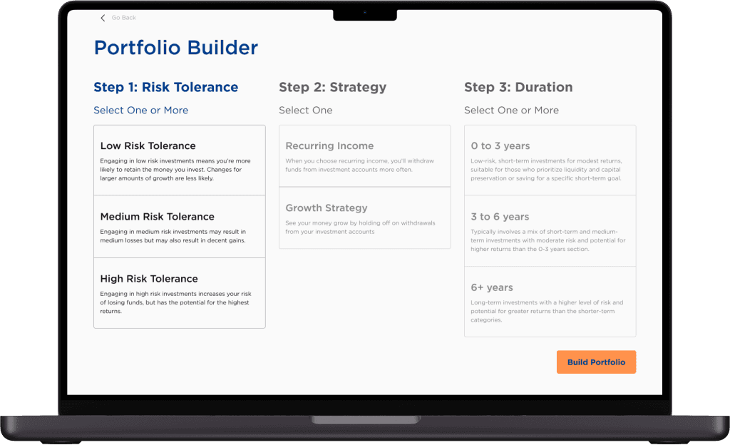 I was tasked to create user flows for creating an account, and selecting portfolio preferences. To ensure a user-friendly experience, we kept our intended audience in mind and prioritized providing essential information necessary for their investment decisions.