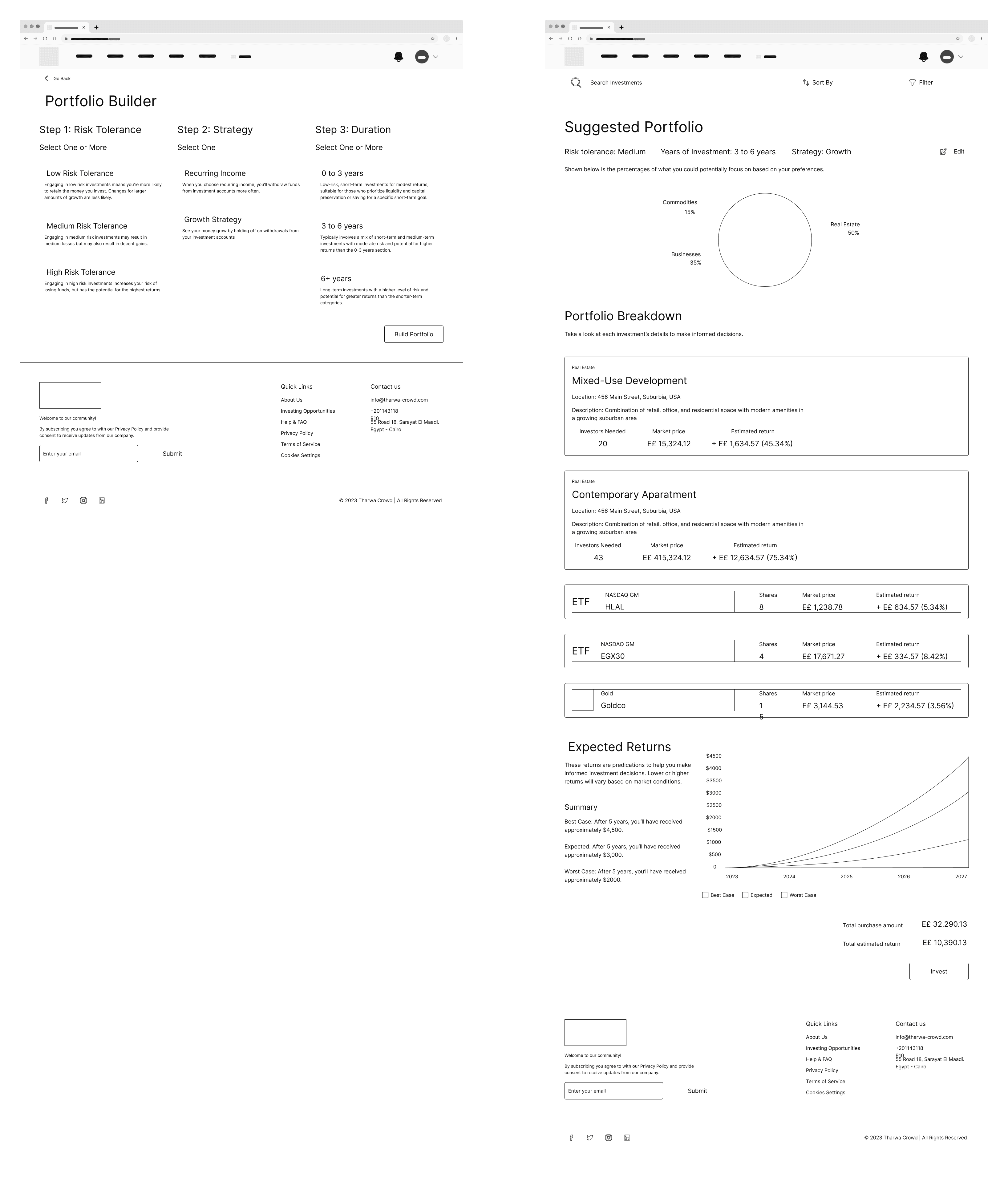 Since the main objective is have a feature that generates an investment portfolio, I suggested to create a Portfolio Builder page, which lets investors pick preferences step by step. Then the team decided to design additional pages such as a login page, landing page, home page, and an investment details page.