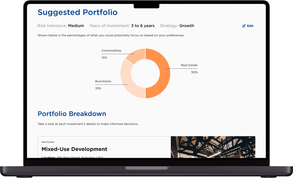 Design a user-friendly website that provides personalized investment portfolio in real estate, businesses, and gold.